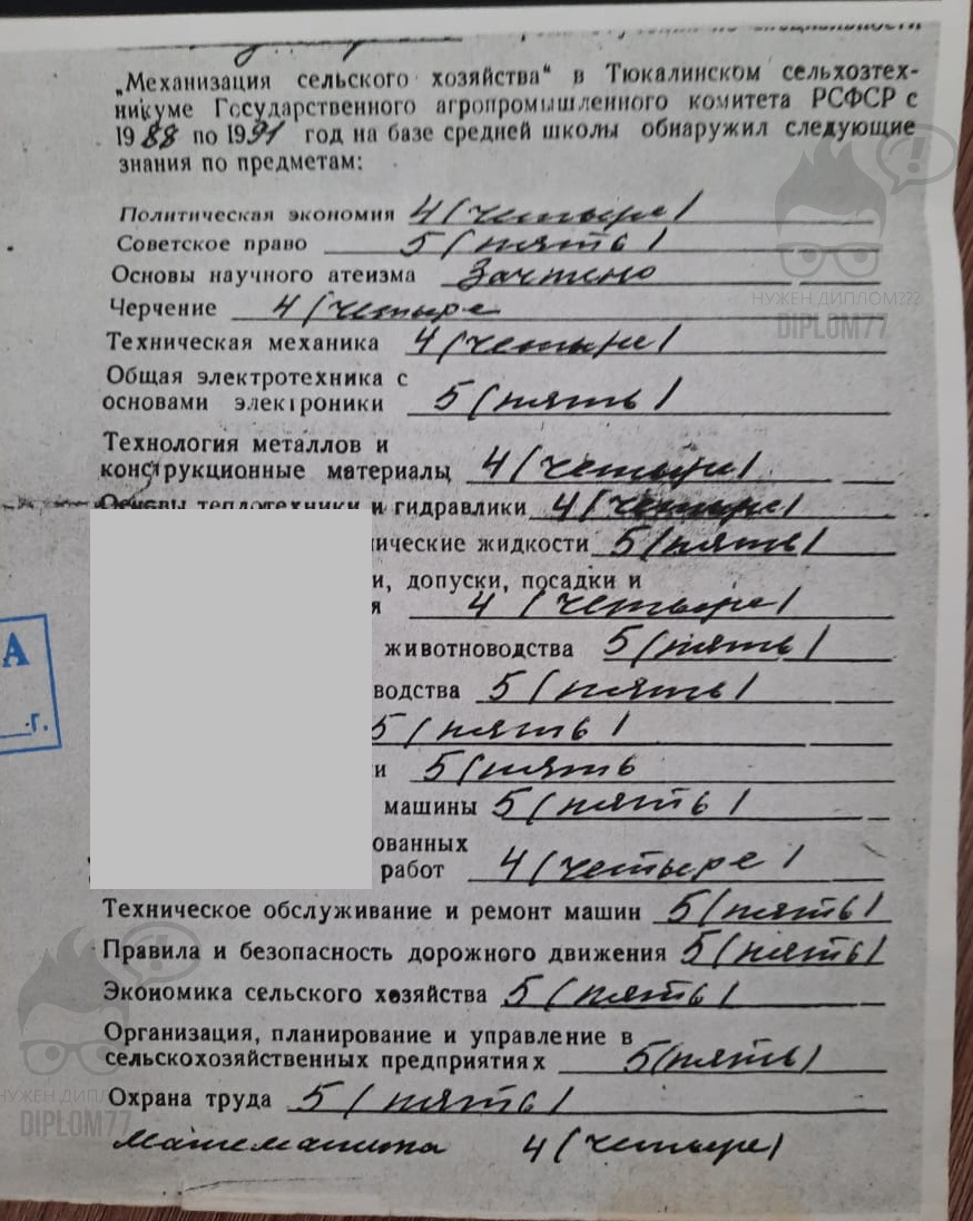Вопрос: Здравствуйте. Возможно ли у вас купить диплом об окончании Тихорецкого техникума ТТОТ с 2022г. по 2025г. С оценками 4 по всем предметам и нужно ли будет высылать вам все предметы, которые у нас были?. Чтобы потом с этим дипломом я смогла поступить в университет и не было никаких проблем с проверкой этого диплома.