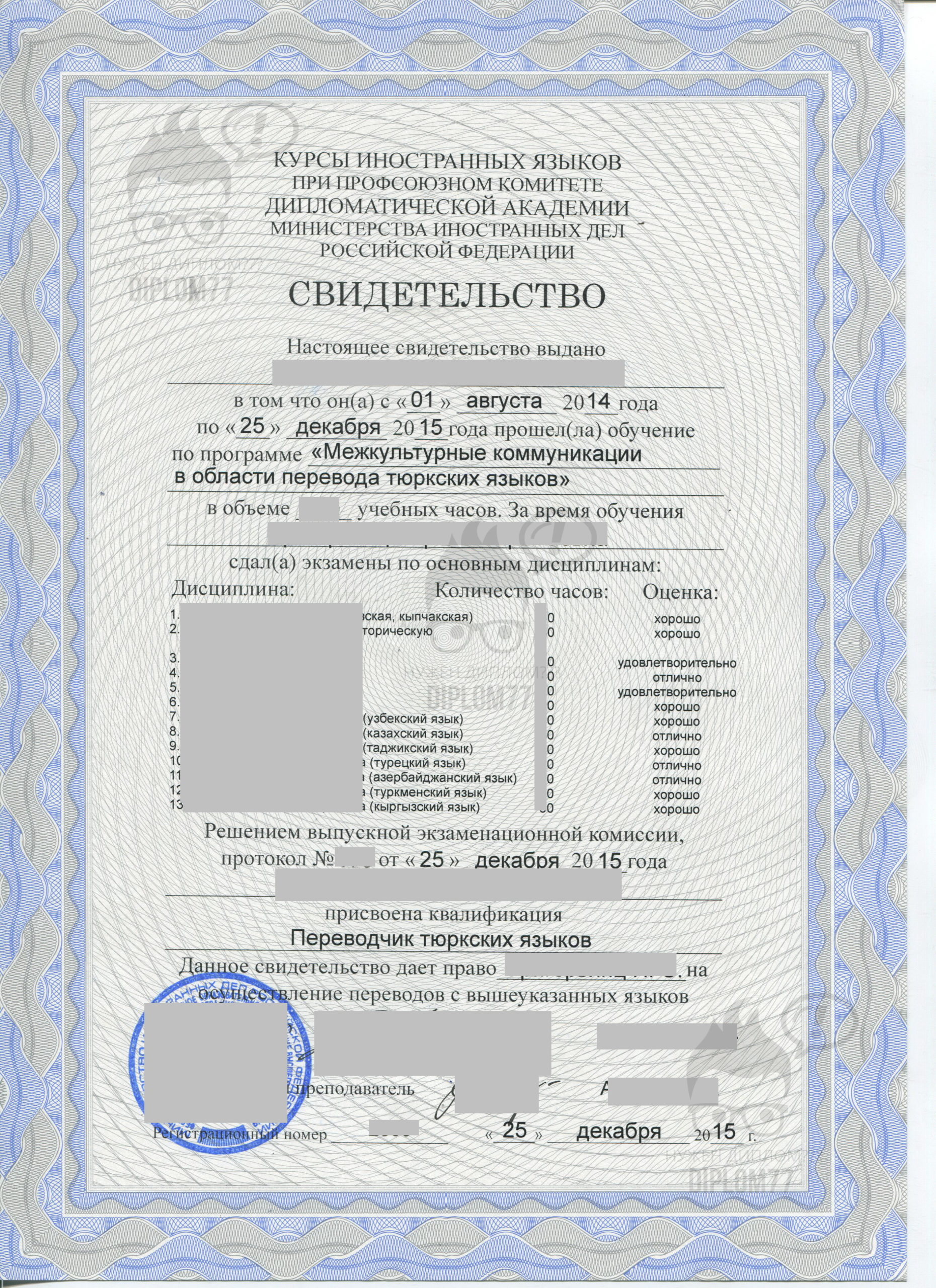 Вопрос: Здравствуйте. Мне нужен сертификат о прохождении языковые курсов. Вот как на образце-с тюркских языков. И второй с хватом ещё нескольких языков. Для работы переводчиком у нотариуса
