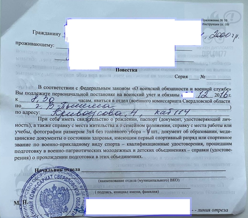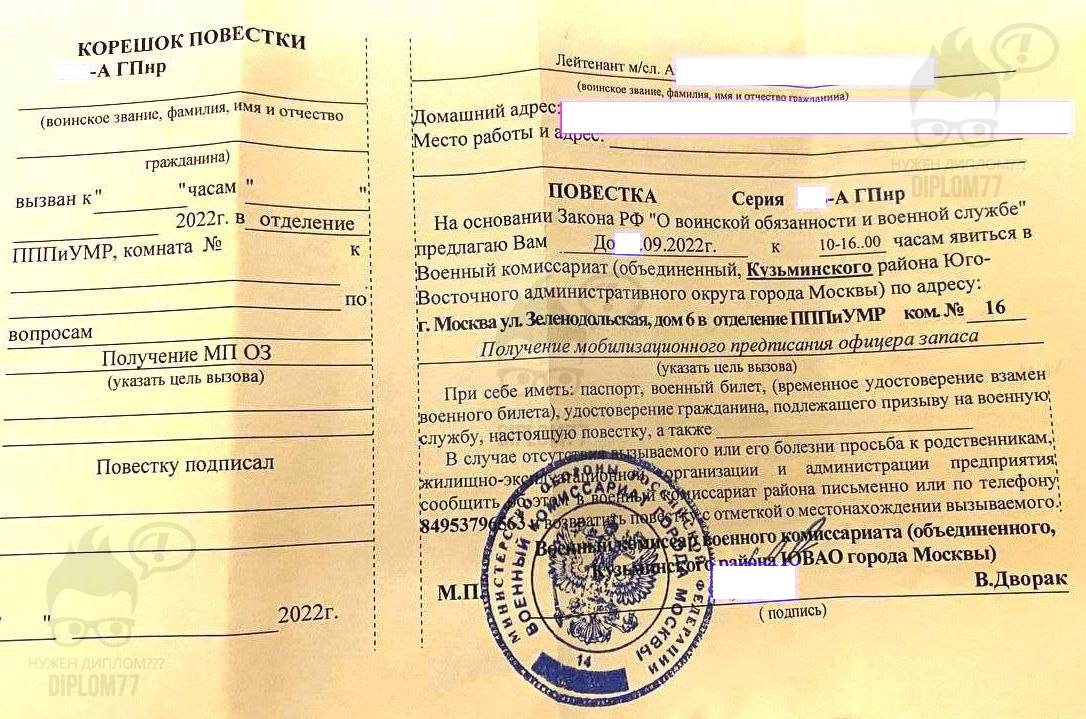 Ответ: Здравствуйте. Да, у нас только настоящие мокрые печати — по другому не делаем. Фото образца и фото готового документа можем выслать. Повестка из военкомата стоит 10 000 рублей. Делается за 1-2 рабочих дня и плюс время доставки. Заказать документ можно (текущая страница). Подробнее о вариантах оплаты и доставки здесь: https://diplom77f.cfd/dostavka