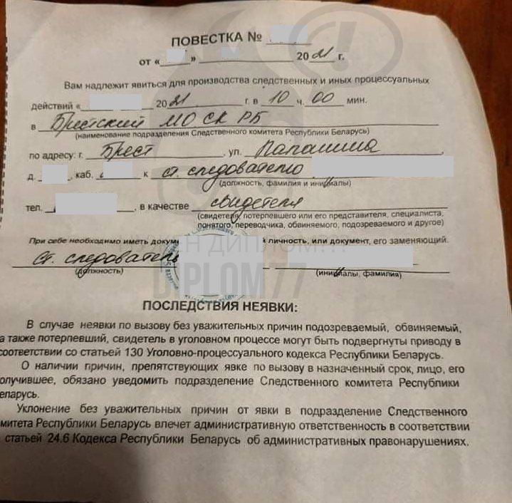 Если у вас есть образец повестки и вы знаете что в нём надо изменить — сбрасывайте всё это на Ватсапп и мы сделаем нужны документ. Например очень часто заказывают повестки из Белоруси. Если образца нет, то мы сами можем сделать нужную повестку (из полиции или следственного комитета).